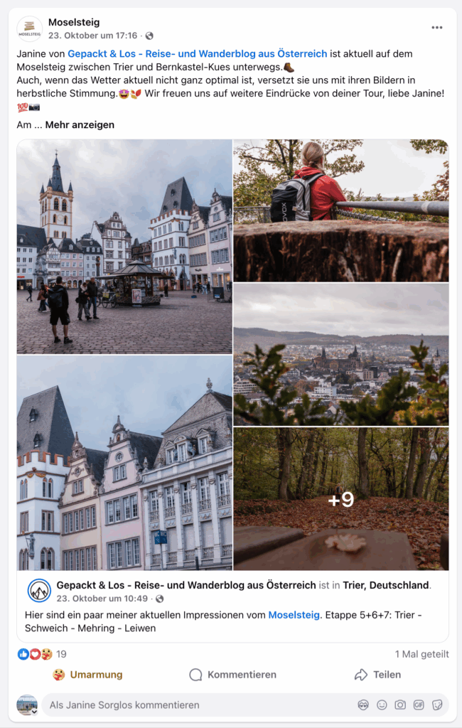 - Multichannel-Ausspielung: Komoot, Website & Blog, Instagram & Facebook